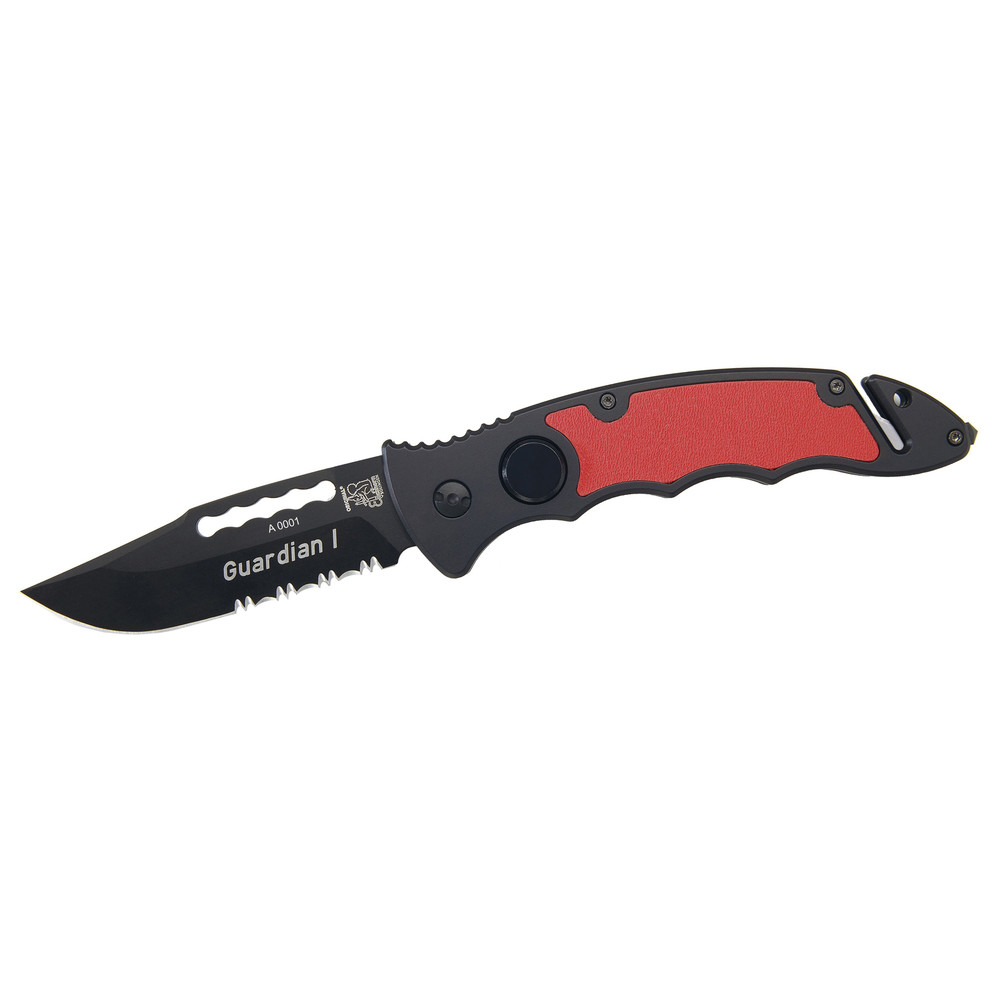 Nož za spašavanje Eickhorn Guardian dokazuje se tisućama puta u teškoj upotrebi u vatrogasnim postrojbama, jedinicama SAR-a, policiji i vojsci. Crna aluminijska školjka s crvenim umetkom Kydex, crna oštrica. Razbijač stakla, rezač remena, ručna osovina.