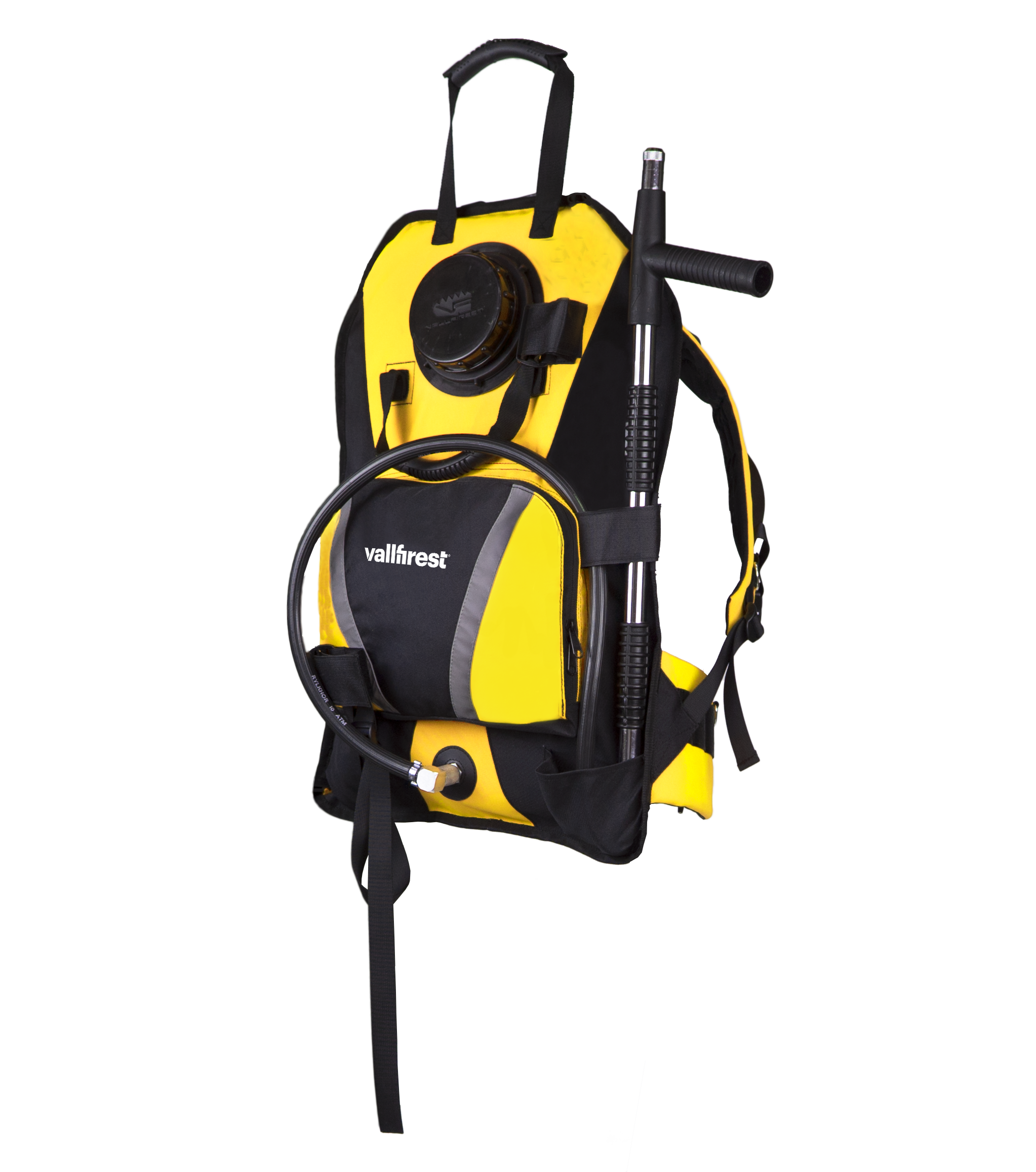 U kompletu se nalazi ručna pumpa s dvostrukim klipom, koja omogućuje kontinuirani mlaz i pri potisku i pri povlačenju. Jednostavnim zakretanjem vrha mlaznice moguće je prilagoditi način rada između koncentriranog mlaza i raspršenog mlaza, ovisno o vrsti intervencije. Pumpa je izrađena od kvalitetnih materijala, a ergonomski oblikovana ručka olakšava uporabu i povećava sigurnost tijekom rada.